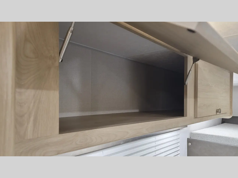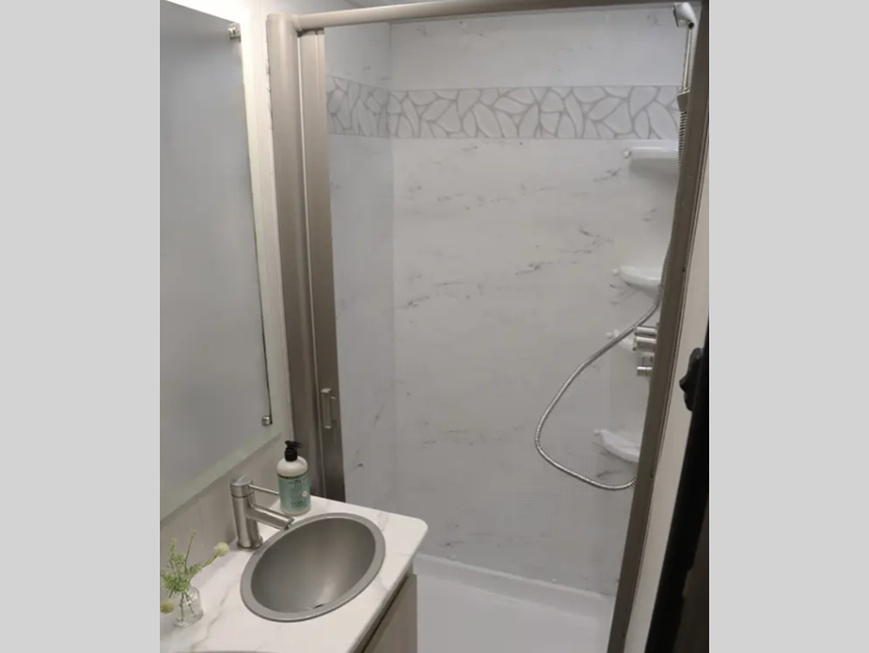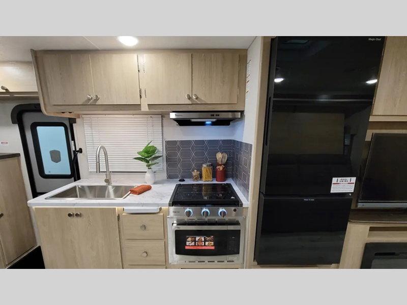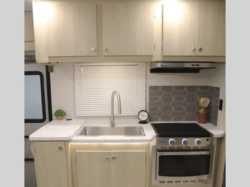 A few of the top features that stand out are the on-demand tankless water heater, the max-length power awning, and the AlphaPly TPO seamless one-piece roof membrane. You will love the premium one-piece thermofoil countertops inside, along with premium vinyl flooring, a shower skylight, a high-rise kitchen faucet, and many more comforts.