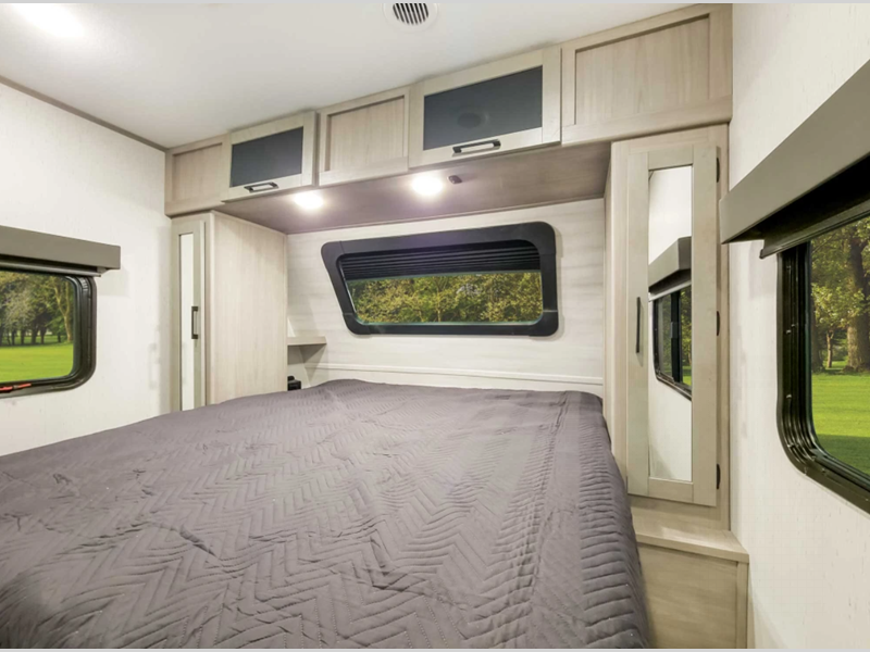 Each model comes standard with aluminum entry steps for stability when entering and exiting your RV, and the heated and enclosed underbelly adds extra protection to your unit. You will enjoy a residential king bed for comfort, a 6' 8" interior height that will make it feel more like home, plus roller night shades for privacy when you want it. And we haven't even touched on the exterior features you are sure to love, like the Bear Cave storage, adjustable power awning, exterior spray port to wash of hiking gear, and so much more!