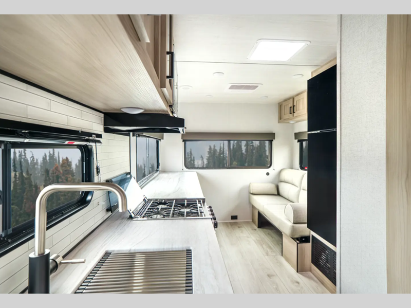 Each is built with an enclosed and heated underbelly plus enclosed holding tanks for four seasons of travel, and include a power tongue jack with an LED light for easy setup day or night. The interior includes seamless pressed countertops, upgraded design package, an 81" ceiling height, plus many more comforts. You will be able to do and see more with the Adventure Outdoor Package with a universal docking station, solar prep, an outside shower, and more!