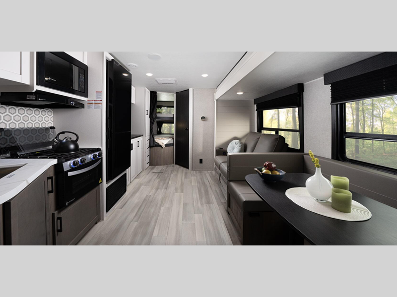 Inside, you'll appreciate the pet and kid friendly residential vinyl flooring that is easy to clean, plus there are hardwood cabinet doors and pressed membrane kitchen countertops you are sure to love. The Open Range Conventional is available in many floorplans, including easy-to-tow single-axle models and spacious dual-axle models; there's something for everyone!