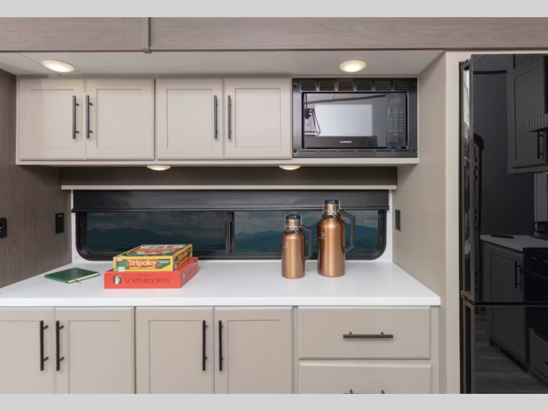 You'll be met with residential features inside, such as solid surface kitchen countertops, hardwood cabinet doors, dimmable lights in select areas, and more. The Climate Guard Protection Package will help extend your camping season so you can travel in colder months, and there are added safety features for your peace of mind.