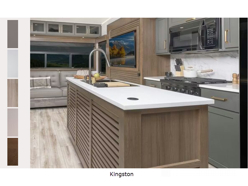Sleeps 4 Slides 3 Length 34 ft Ext Height 13 ft 4 in Interior Color Kingston Hitch Weight 2455 lbs Dry Weight 11692 lbs Cargo Capacity 3608 lbs Fresh Water Capacity 75 gals Grey Water Capacity 87 gals Black Water Capacity 48 gals Tire Size ST235/80R16G Furnace BTU 35000 btu Available Beds King Refrigerator Type GE Energy Star Residential with Ice Maker Refrigerator Size 18 cu ft Cooktop Burners 3 Number of Awnings 2 Axle Weight 7000 lbs LP Tank Capacity 30 lbs Water Heater Type On Demand AC BTU 15000 btu TV Info LR 50" LED Smart TV Awning Info 10' and 16' Electric with LED Lights Axle Count 2 Washer/Dryer Available Yes Number of LP Tanks 2 Shower Type Radius Electrical Service 50 amp Similar Floorplans