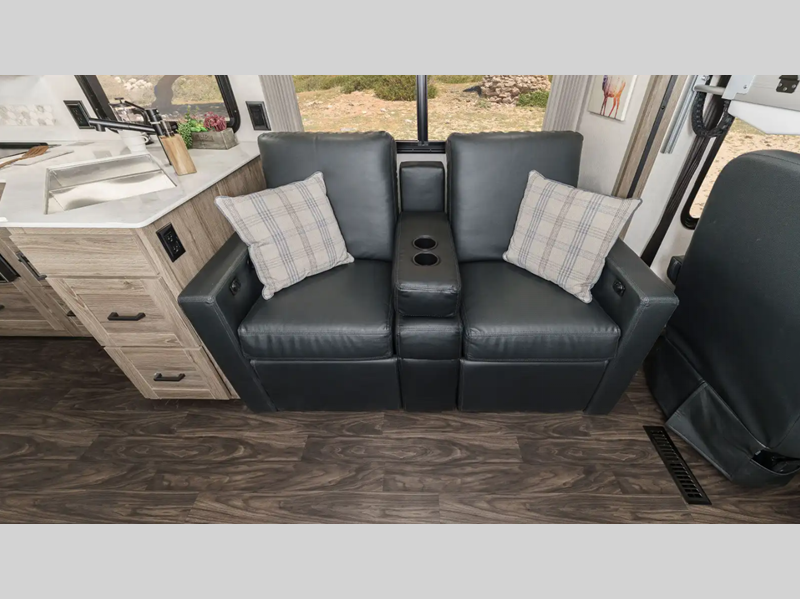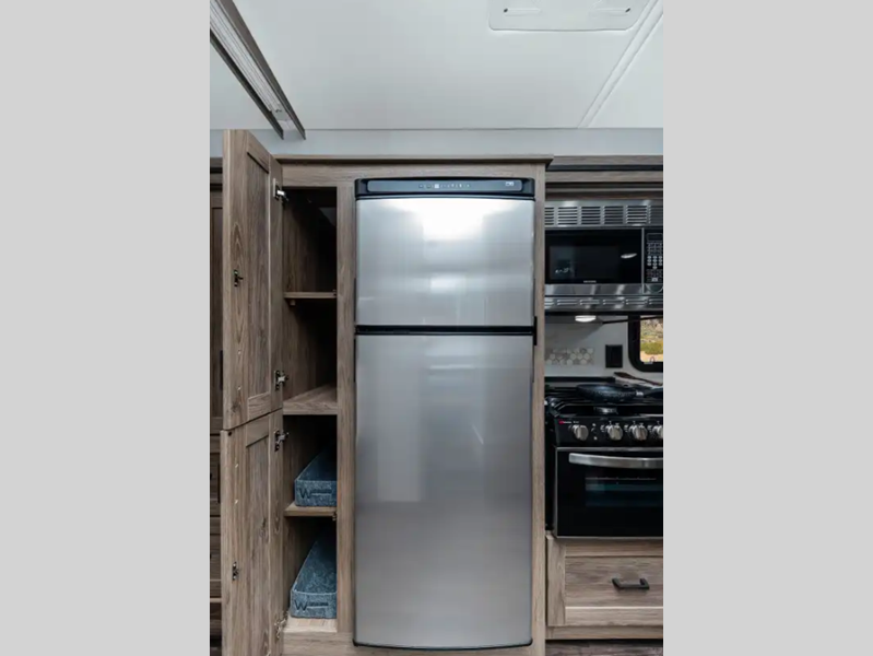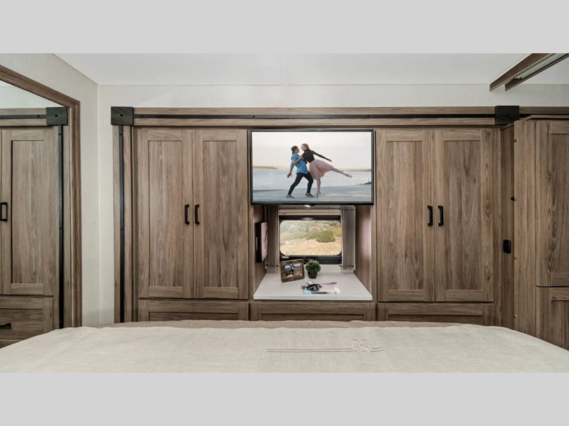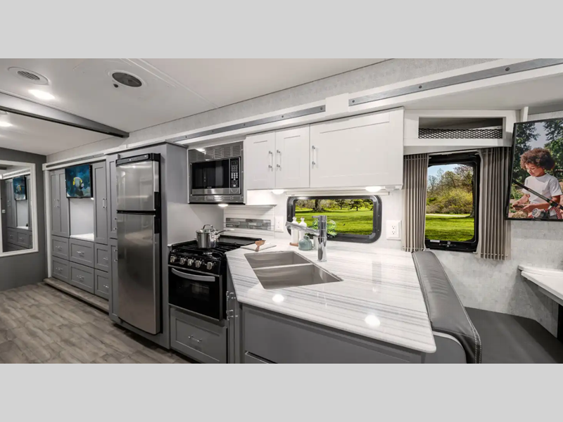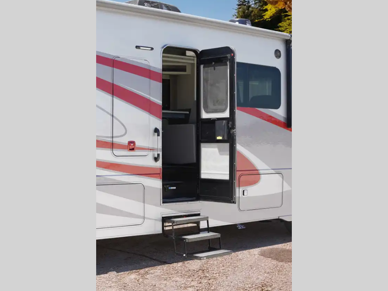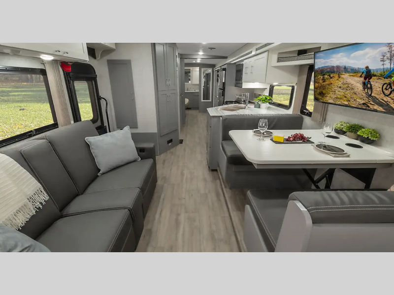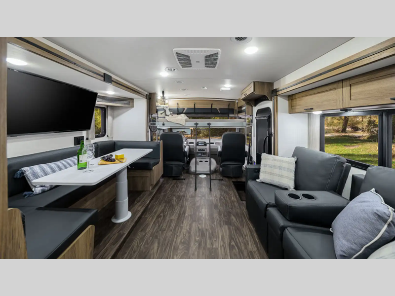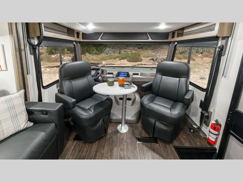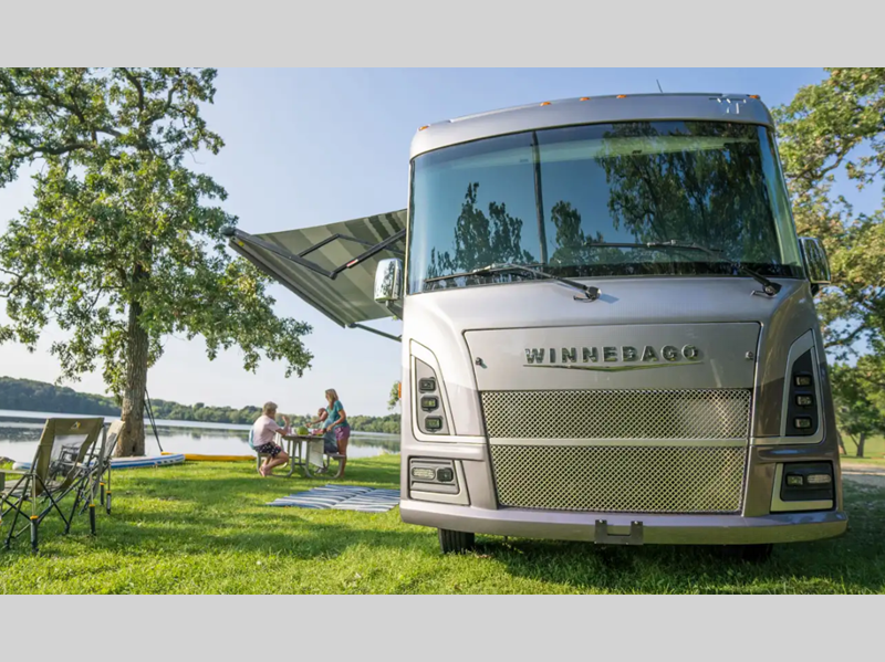 The Vista offers a contemporary design with a spacious lounge area, luxurious fabrics, and the most expansive views of your surroundings due to the 1-piece windshield and streamlined A-pillars. You will enjoy easy access to the slides, awning, jacks and Studio bed lift with the Winnebago Control™ which allows you to use a single panel or your phone to set things up and get things ready when it's time to go.