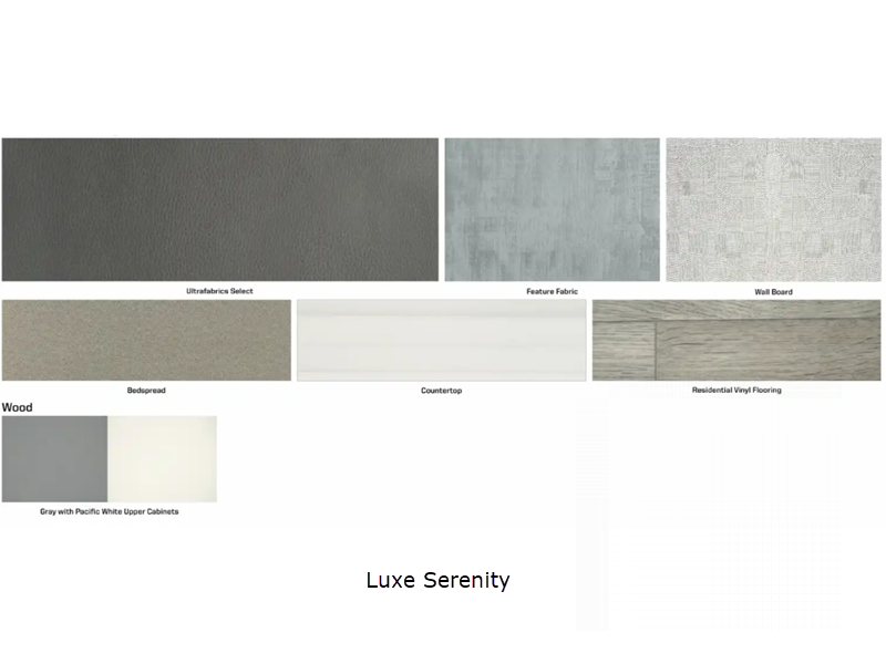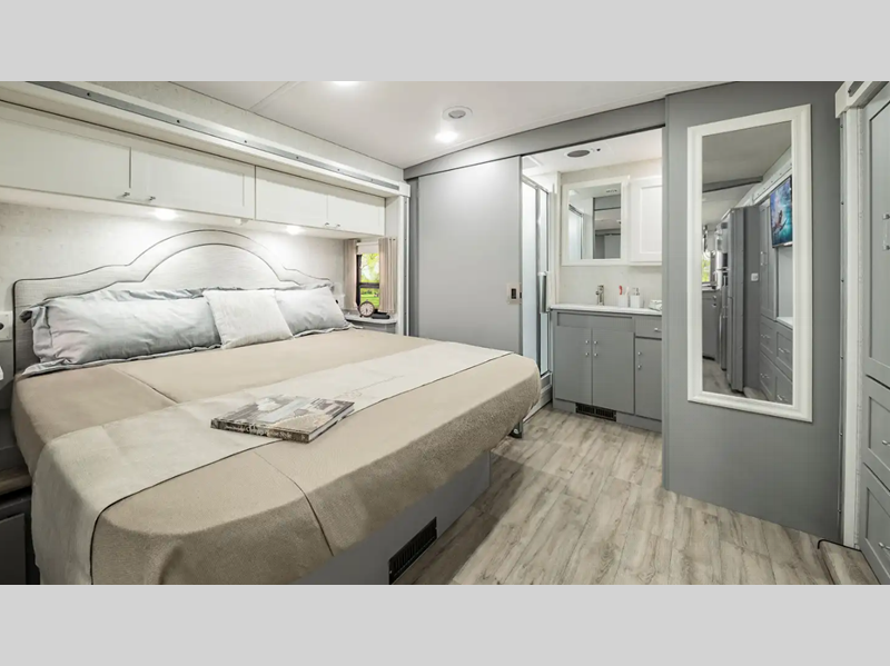 Sleeps 6 Slides 2 Length 35 ft 5 in Ext Width 8 ft 6 in Ext Height 12 ft 4 in Int Height 6 ft 10 in Interior Color Town & Country w/Dark or Light Ultrafabric, Luxe Serenity Exterior Color Full Body Paint; Cloud Burst, Toreador, Moonlight. Deluxe Exterior Graphics; Deep Sea, Flintstone Hitch Weight 5000 lbs GVWR 22000 lbs Fresh Water Capacity 74 gals Grey Water Capacity 42 gals Black Water Capacity 42 gals Tire Size 19.5" Furnace BTU 35000 btu Generator 5,500-watt gas Fuel Type Gasoline Engine 7.3L PFI V8 Chassis Ford F53 Fuel Capacity 80 gals Wheelbase 228 in Available Beds King Murphy Refrigerator Type Large 2 Door Stainless Steel w/Freezer Refrigerator Size 10 cu ft Cooktop Burners 3 Shower Size 34" x 34" Number of Awnings 1 Axle Weight Front 8000 lbs Axle Weight Rear 15000 lbs LP Tank Capacity 76.14 lbs Water Heater Capacity 6 gal Water Heater Type LP with Electronic Ignition AC BTU 27000 btu Basement Storage 159 cu. ft. TV Info LR 39" LCD HDTV, Ext. 32" HDTV Awning Info 22' Power w/ LED Lighting Gross Combined Weight 26000 lbs Shower Type Radius Electrical Service 30 amp Similar Floorplans