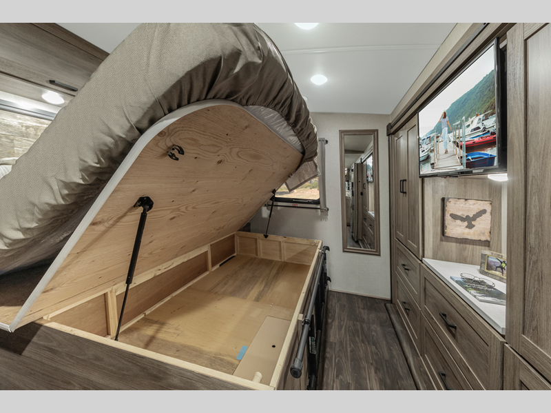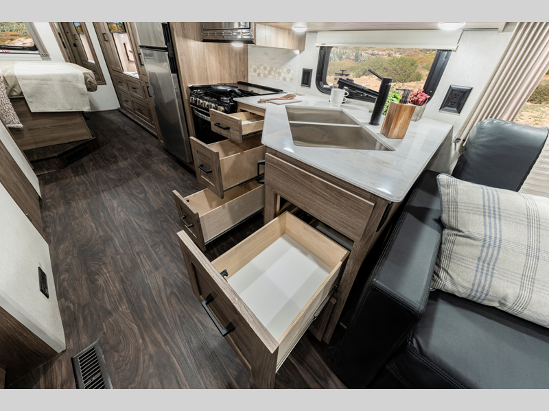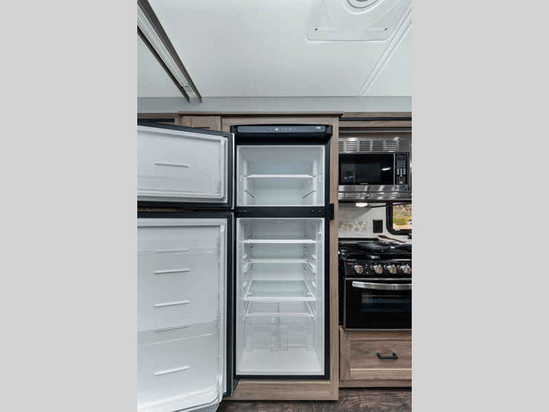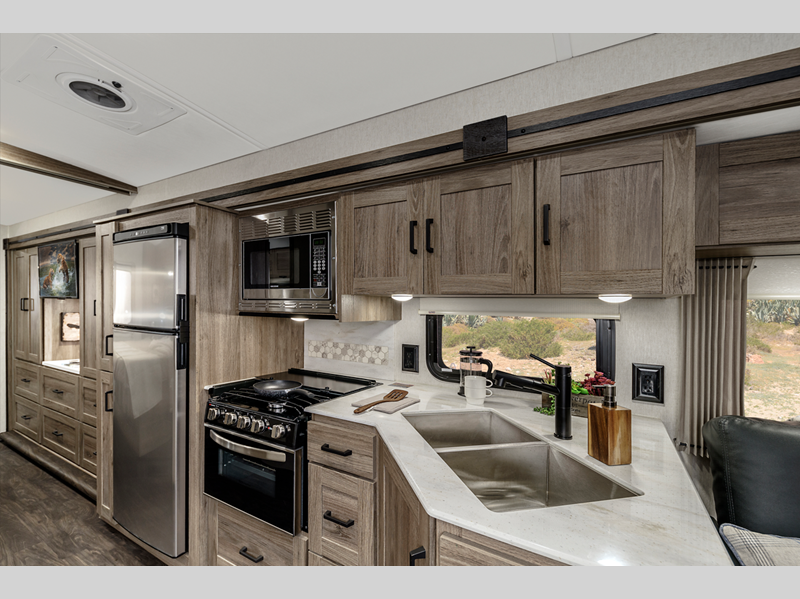 With its special mountain-inspired paint scheme, they stand out on the road and the interior décor with Salinas oak cabinets create a special outdoorsy feel. Your outdoor living is enhanced with a Batwing awning which overlaps the standard armless patio awning for two sides of seamless wraparound protection rain or shine. The Tailgate package includes an exterior kitchen that comes with a refrigerator, a sink and a quick connect LP hose for a portable stove or grill making it perfect for entertaining!