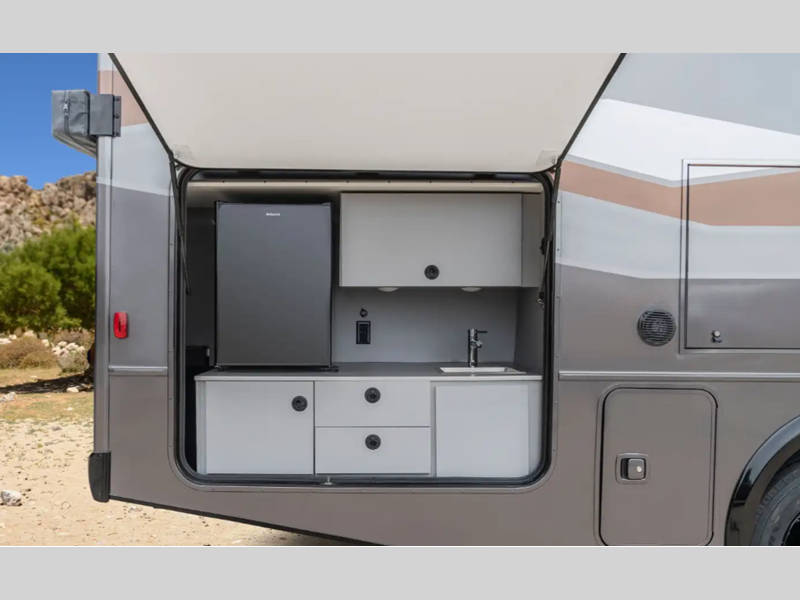 - Tailgate Package: refrigerator, storage cabinet, LED lights, LP Quick Connect, stainless steel sink, single-lever faucet, wall mounted bottle opener, paper towel holder